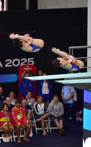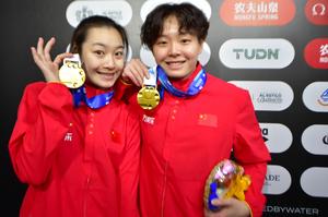 (250405) -- JALISCO, 5 abril, 2025 (Xinhua) -- Chen Yiwen y Chang Yani, de China, compiten durante la final...