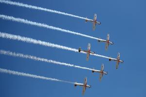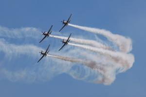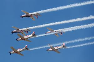 (250406) -- ZEMUNIK, (Xinhua) -- Imagen de 5 de abril de 2025 de un vuelo acrobático del equipo de acrobacias...
