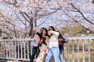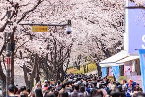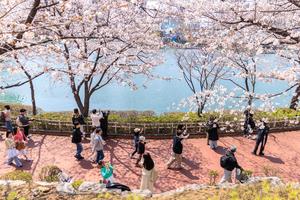 (250406) -- SEUL, 6 abril, 2025 (Xinhua) -- Personas posan para fotografías bajo las flores de cerezo junto al lago...