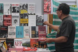 (250406) -- SANTIAGO, 6 abril, 2025 (Xinhua) -- Imagen del 5 de abril de 2025 de un expositor acomodando libros...