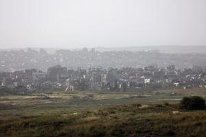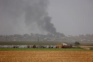 (250403) -- FRONTERA ISRAEL-GAZA, 3 abril, 2025 (Xinhua) -- Humo se eleva desde edificios dañados en la Franja de Gaza,...
