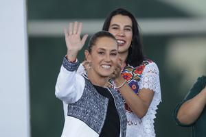 (250403) -- CIUDAD DE MEXICO, 3 abril, 2025 (Xinhua) -- La presidenta mexicana, Claudia Sheinbaum (frente), reacciona a su llegada...