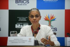 (250403) -- BRASILIA, 3 abril, 2025 (Xinhua) -- La ministra de Medio Ambiente y Cambio Climático brasileña, Marina Silva, habla...