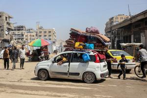 (250403) -- GAZA, 3 abril, 2025 (Xinhua) -- Palestinos que huyen del barrio de Shuja'iyya son vistos en la Ciudad...
