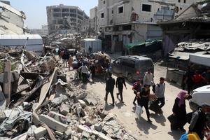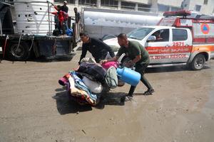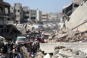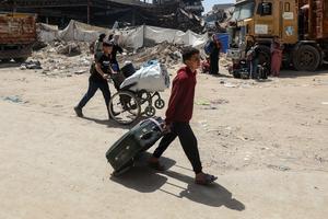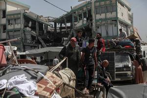 (250403) -- GAZA, 3 abril, 2025 (Xinhua) -- Palestinos que huyen del barrio de Shuja'iyya son vistos en la Ciudad...