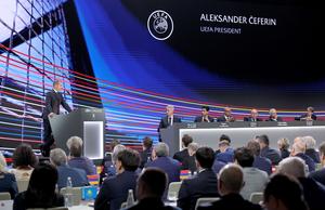 (250403) -- BELGRADO, 3 abril, 2025 (Xinhua) -- El presidente de la UEFA, Aleksander Ceferin (i-arriba), habla durante el 49...