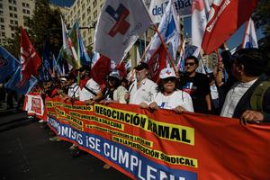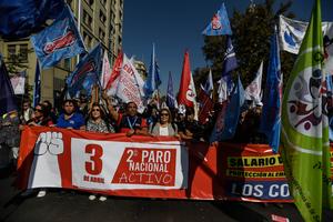 (250403) -- SANTIAGO, 3 abril, 2025 (Xinhua) -- Manifestantes participan en una marcha y paro nacional activo convocados por la...