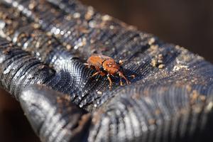 (250403) -- MONTEVIDEO, 3 abril, 2025 (Xinhua) -- Un trabajador sostiene un ejemplar del insecto "picudo rojo de las palmeras"...