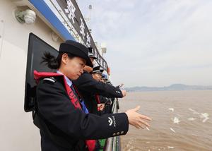 (250403) -- BEIJING, 3 abril, 2025 (Xinhua) -- Oficiales de policía rinden tributo a los mártires en un barco de...