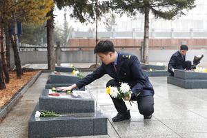 (250403) -- BEIJING, 3 abril, 2025 (Xinhua) -- Trabajadores del ferrocarril rinden tributo a los mártires en un cementerio de...