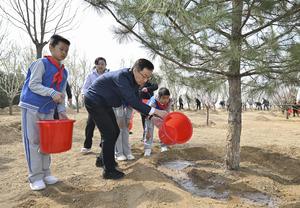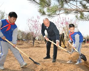 (250403) -- BEIJING, 3 abril, 2025 (Xinhua) -- Han Zheng planta un árbol durante una actividad voluntaria de plantación de...