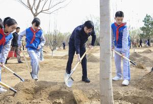 (250403) -- BEIJING, 3 abril, 2025 (Xinhua) -- Cai Qi planta un árbol durante una actividad voluntaria de plantación de...