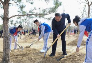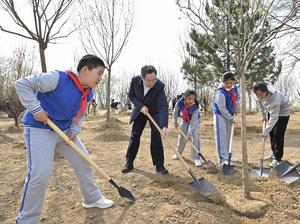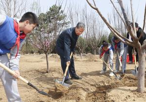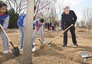 (250403) -- BEIJING, 3 abril, 2025 (Xinhua) -- Ding Xuexiang planta un árbol durante una actividad voluntaria de plantación de...