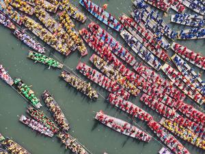 (250406) -- JIANGYAN, 6 abril, 2025 (Xinhua) -- Vista aérea tomada con un dron el 6 de abril de 2025 de personas reuniéndose para el Festival de Botes de Qintong 2025 llevado a cabo en el Parque Nacional de Humedales de Qinhu, en el distrito de Jiangyan de Taizhou, en la provincia de Jiangsu, en el este de China. Más de 500 botes con más de 10.000 tripulantes a bordo, se reunieron aquí el domingo para el Festival de Botes de Qintong que ha sido una tradición de siglos de antigüedad. El Festival de Botes de Qintong fue enlistado como patrimonio cultural inmaterial a nivel estatal en 2008. (Xinhua/Ji Chunpeng) (rtg) (ah)