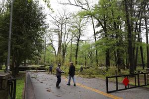 (250407) -- LITTLE ROCK, 7 abril, 2025 (Xinhua) -- Imagen del 6 de abril de 2025 de trabajadores intentando remover árboles derrumbados por los fuertes vientos, en Little Rock, Arkansas, Estados Unidos. Feroces tormentas han azotado vastas franjas del Medio Oeste y el Sur de Estados Unidos durante cuatro días, desatando cientos de tornados, fuertes lluvias e inundaciones históricas que hasta el sábado por la noche habían cobrado al menos 16 vidas. (Xinhua/Yan Sun) (rtg) (ah) (vf)