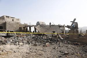 (250407) -- SANA, 7 abril, 2025 (Xinhua) -- Un miembro de pruebas forenses trabaja en una casa destruida por ataques...