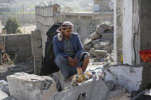 (250407) -- SANA, 7 abril, 2025 (Xinhua) -- Un hombre observa los escombros de una casa destruida por ataques aéreos...