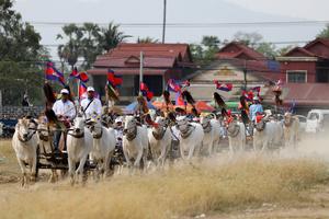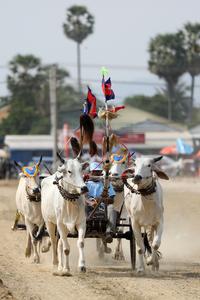 (250407) -- KAMPONG SPEU, 7 abril, 2025 (Xinhua) -- Concursantes participan en una carrera de carretas de bueyes, en la...