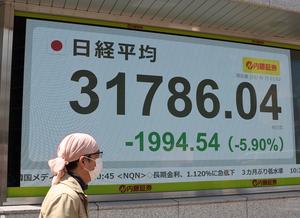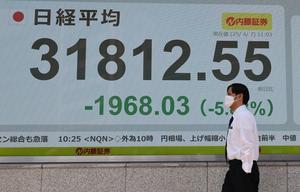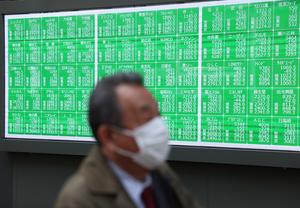 (250407) -- TOKIO, 7 abril, 2025 (Xinhua) -- Una persona camina frente a una pantalla que muestra información del mercado...