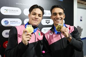 (250406) -- JALISCO, 6 abril, 2025 (Xinhua) -- Osmar Olvera y Juan Celaya, de México, muestran sus medallas de oro...