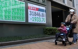 (250407) -- TOKIO, 7 abril, 2025 (Xinhua) -- Personas pasan frente a una pantalla que muestra información del mercado de...