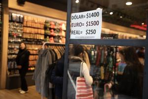 (250407) -- BUENOS AIRES, 7 abril, 2025 (Xinhua) -- Un cartel indica la cotización del dólar paralelo en un local...