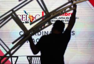 (250407) -- TEGUCIGALPA, 7 abril, 2025 (Xinhua) -- Una persona carga sillas durante la Reunión Ordinaria de Coordinadores Nacionales previo...