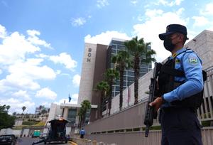 (250407) -- TEGUCIGALPA, 7 abril, 2025 (Xinhua) -- Un policía vigila frente al Banco Central de Honduras, que será la...