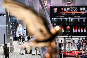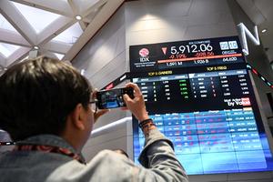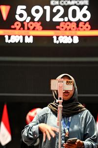 (250408) -- YAKARTA, 8 abril, 2025 (Xinhua) -- Un hombre toma fotografías de un panel que muestra el Índice Compuesto...