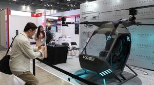 (250408) -- GOYANG, 8 abril, 2025 (Xinhua) -- Un visitante toma fotografías de una aeronave inteligente durante el Salón de...