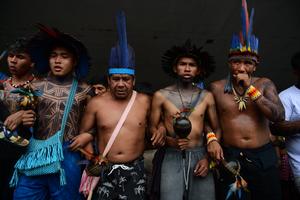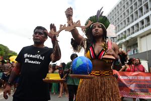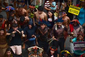 (250408) -- BRASILIA, 8 abril, 2025 (Xinhua) -- Indígenas cargan una balanza mientras participan en una manifestación en el Campamento...