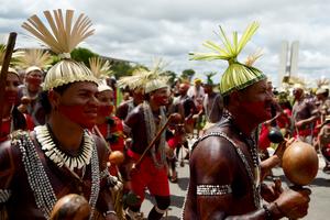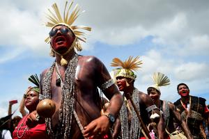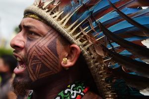 (250408) -- BRASILIA, 8 abril, 2025 (Xinhua) -- Un hombre indígena participa en una manifestación en el Campamento "Tierra Libre",...