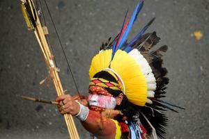 (250408) -- BRASILIA, 8 abril, 2025 (Xinhua) -- Un hombre indígena pataxo apunta con su arco y flecha durante una...