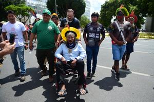 (250408) -- BRASILIA, 8 abril, 2025 (Xinhua) -- El líder indígena, Raoni Metuktire (c-frente), participa en una manifestación en el...
