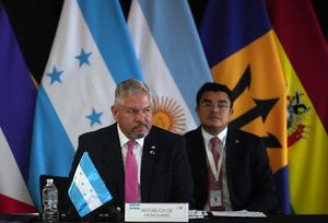 (250408) -- TEGUCIGALPA, 8 abril, 2025 (Xinhua) -- El canciller hondureño, Enrique Reina (frente), participa en la Reunión de Cancilleres...