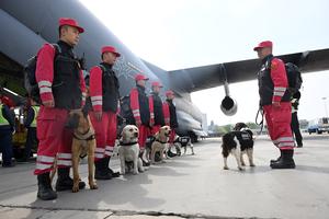 (250409) -- BEIJING, 9 abril, 2025 (Xinhua) -- Miembros del Equipo de Búsqueda y Rescate Internacional de China llegan a...