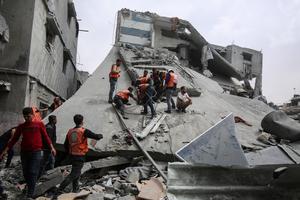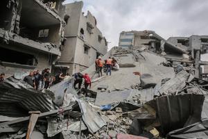 (250409) -- GAZA, 9 abril, 2025 (Xinhua) -- Rescatistas buscan sobrevivientes entre los escombros de los edificios destruidos, en el...