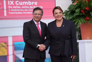 (250409) -- TEGUCIGALPA, 9 abril, 2025 (Xinhua) -- La presidenta hondureña, Xiomara Castro (d), recibe al presidente colombiano, Gustavo Petro...