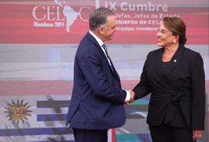 (250409) -- TEGUCIGALPA, 9 abril, 2025 (Xinhua) -- El presidente boliviano, Luis Arce, saluda a su llegada a la IX...