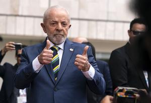(250409) -- TEGUCIGALPA, 9 abril, 2025 (Xinhua) -- El presidente brasileño, Luiz Inácio Lula da Silva, reacciona a su llegada...
