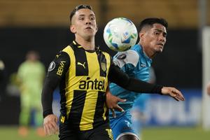 (250409) -- MONTEVIDEO, 9 abril, 2025 (Xinhua) -- Imagen del 8 de abril de 2025 del jugador Leonardo Fernández (i),...
