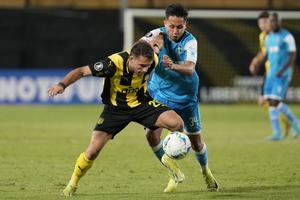 (250409) -- MONTEVIDEO, 9 abril, 2025 (Xinhua) -- Imagen del 8 de abril de 2025 del jugador Pedro Milans (i), de Peñarol de Uruguay, disputando el balón con Gustavo Mendoza (d), de San Antonio Bulo Bulo de Bolivia, durante el partido del grupo H de la jornada 2 de la Fase de Grupos de la Copa Conmebol Libertadores, celebrado en el Estadio Campeón del Siglo, en Montevideo, capital de Uruguay. (Xinhua/Nicolás Celaya) (nc) (ah) (ra) (vf)