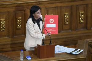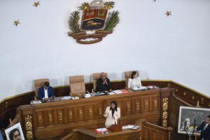(250410) -- CARACAS, 10 abril, 2025 (Xinhua) -- La vicepresidenta venezolana, Delcy Rodríguez, habla durante una sesión de la Asamblea...