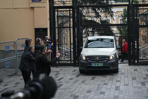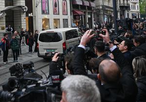 (250410) -- ESTAMBUL, 10 abril, 2025 (Xinhua) -- Un vehículo transportando a delegados estadounidenses se retira del consulado ruso, en...