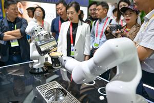 (250413) -- HAIKOU, 13 abril, 2025 (Xinhua) -- Visitantes observan un robot preparando café, en la V Exposición Internacional de...