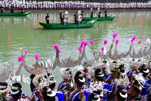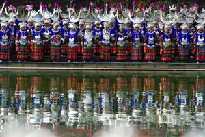 (250413) -- GUIYANG, 13 abril, 2025 (Xinhua) -- Personas en trajes étnicos asisten a un evento de canto para celebrar...