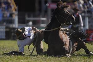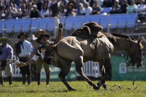 (250413) -- MONTEVIDEO, 13 abril, 2025 (Xinhua) -- Un gaucho se cae de un caballo en las jineteadas durante la...
