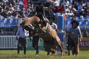(250413) -- MONTEVIDEO, 13 abril, 2025 (Xinhua) -- Un gaucho monta un caballo en las jineteadas durante la 98 edición...