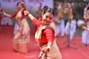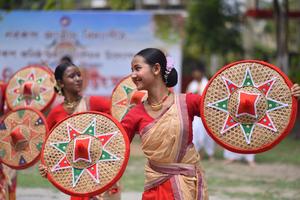 (250413) -- ASSAM, 13 abril, 2025 (Xinhua) -- Imagen del 12 de abril de 2025 de mujeres portando trajes tradicionales...