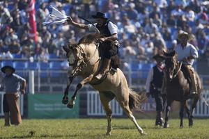(250413) -- MONTEVIDEO, 13 abril, 2025 (Xinhua) -- Un gaucho monta un caballo en las jineteadas durante la 98 edición...